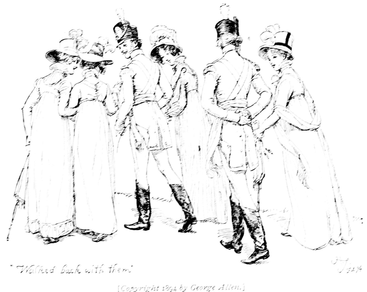 After breakfast, the girls walked to Meryton, to inquire if Mr. Wickham were returned, and to lament over his absence from the Netherfield ball. He joined them on their entering the town, and attended them to their aunt’s, where his regret and vexation and the concern of everybody were well talked over. To Elizabeth, however, he voluntarily acknowledged that the necessity of his absence had been self-imposed.