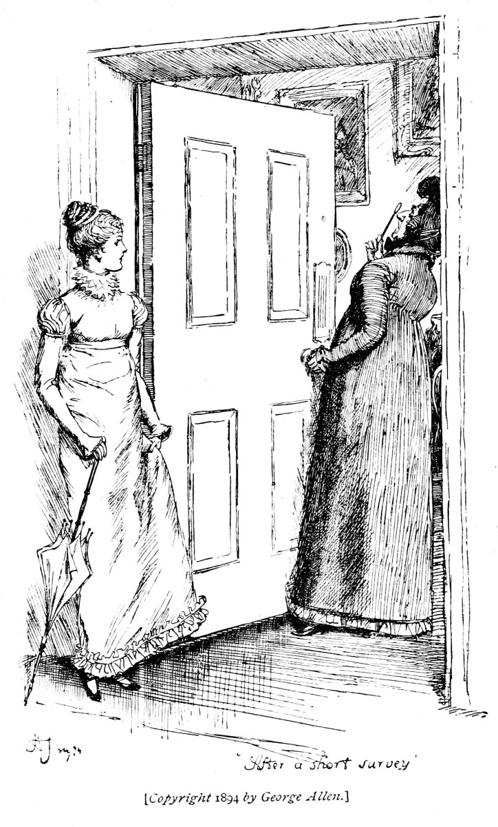 Elizabeth obeyed; and, running into her own room for her parasol, attended her noble guest downstairs. As they passed through the hall, Lady Catherine opened the doors into the dining-parlour and drawing-room, and pronouncing them, after a short survey, to be decent-looking rooms, walked on.